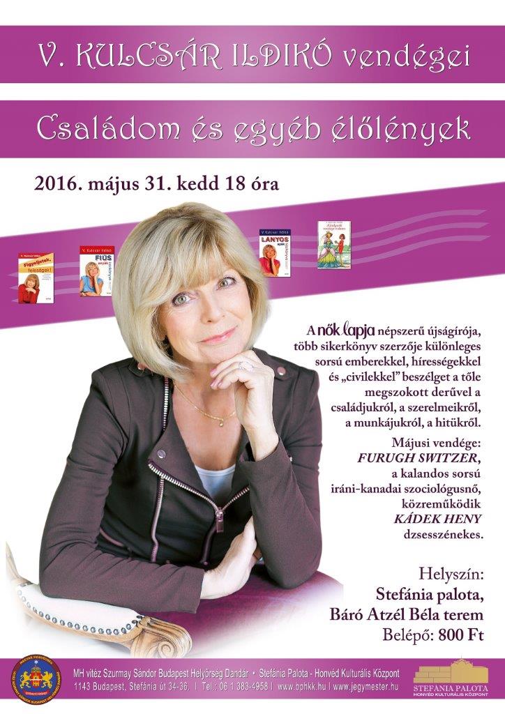 V. Kulcsár Ildikó, a Nők Lapja népszerű újságírója, meghívta beszélgetős estjére Furugh Switzer barátunkat. A Családom és egyéb élőlények sorozatban V. Kulcsár Ildikó, több sikerkönyv szerzője különleges sorsú emberekkel, hírességekkel és „civilekkel” beszélget a tőle megszokott derűvel a családjukról, a szerelmeikről, a munkájukról, a hitükről.