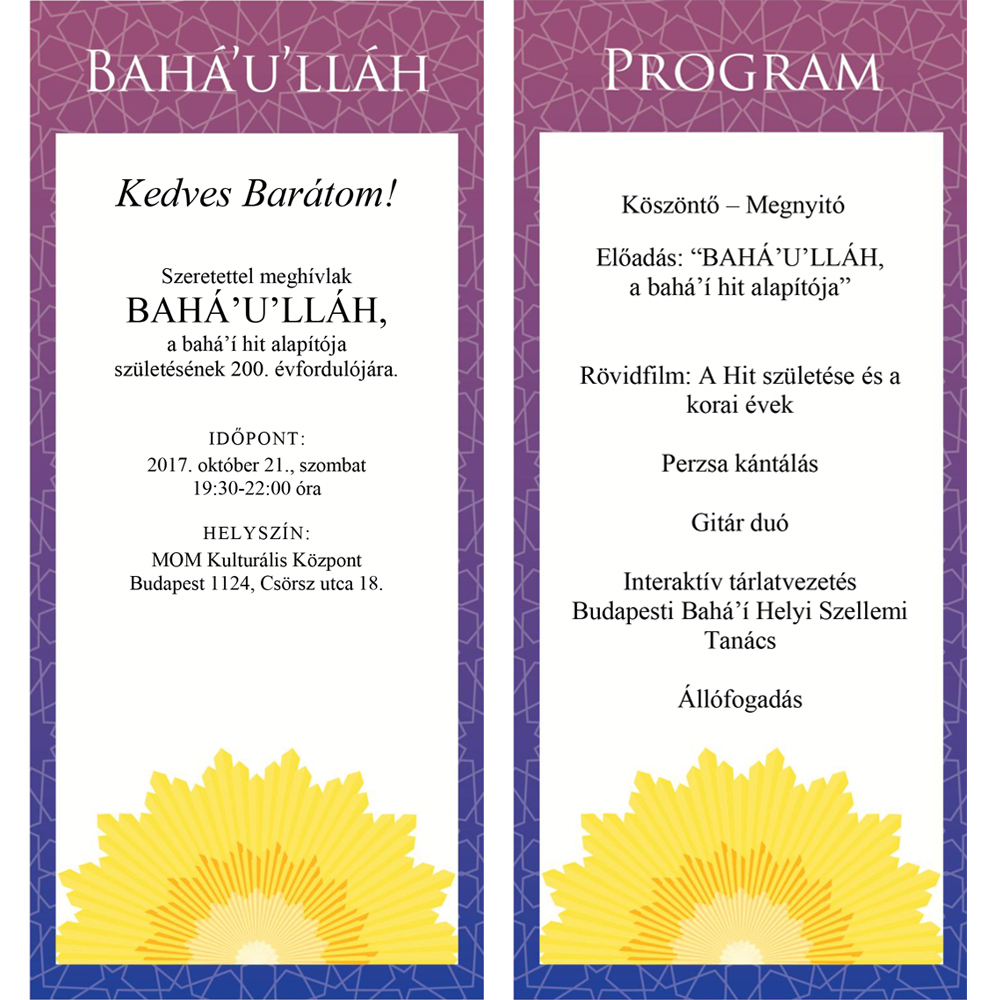 A Budapesti Bahá’í Közösség szeretettel meghívja Önt és kedves családját, Bahá’u’lláh születésének 200. évfordulója alkalmából tartandó ünnepségre, melynek a MOM Kulturális Központ ad otthont. A rendezvény egy világméretű ünnepségsorozat magyarországi része, melyet ez alkalommal előadásokkal, rövid dokumentumfilm vetítéssel, perzsa kántálással, zenészekkel és interaktív tárlatvezetéssel ünneplünk.